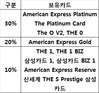 10% : THE 1, THE 1 BIZ, 삼성카드 1, 삼성카드 BIZ 1, American Express Reserve / 신세계 THE S Prestige 삼성카드