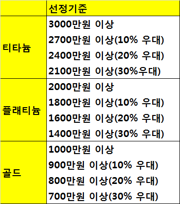 삼성카드 티타늄, 플래티늄, 골드 선정기준은 카드 이용금액에 따른다. 당연히 등급별로 조금씩 차이가 난다.