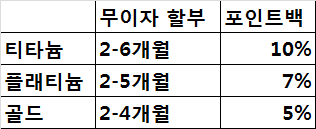 마지막으로 포인트백 같은 경우는 티타늄 회원은 10%이며 플래티늄은 7%, 삼성카드 골드 회원은 5%이며 적립한도는 20만 포인트이다.