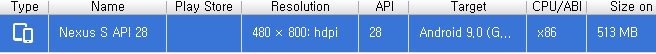 문서의 첫부분에서 생성한 가상 에뮬레이션을 만들었다면 여기 목록에서 보인다.